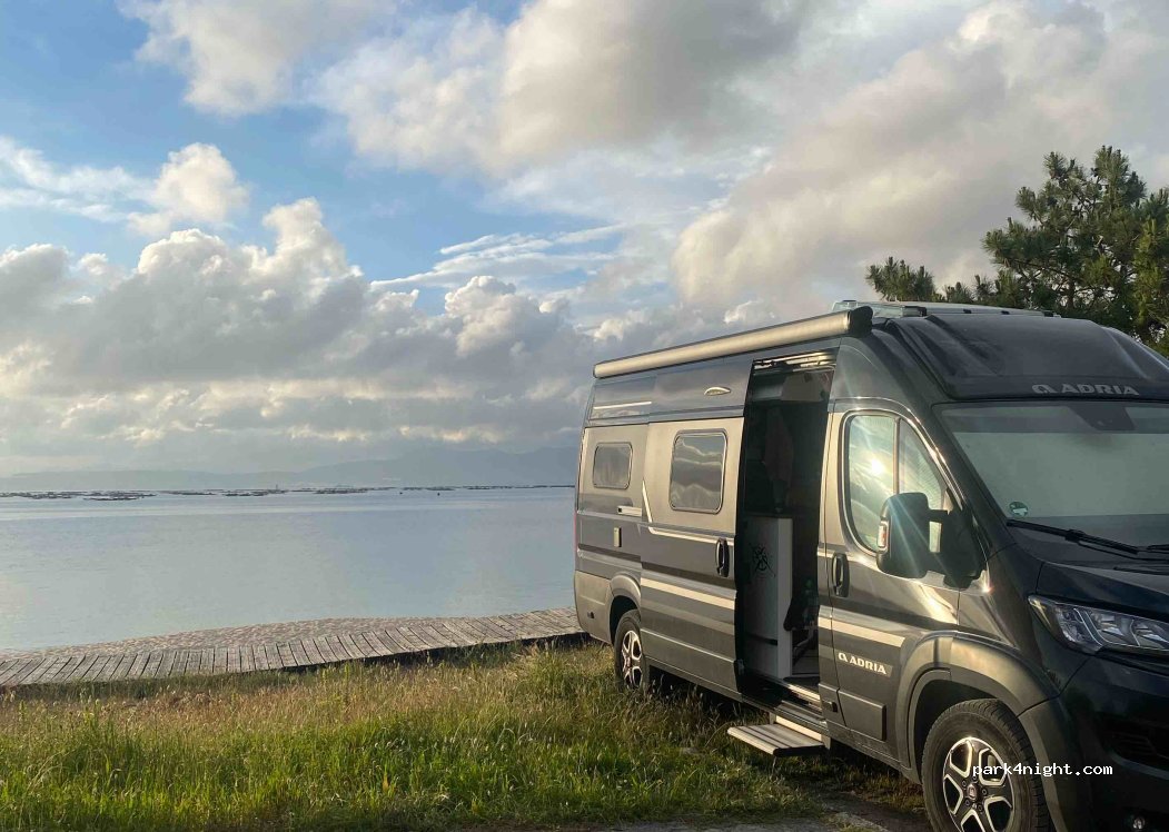 No vimos señal de no pernoctar. Aparcamiento a pie de playa que durante el día, está a tope pero por la noche, nos quedamos unas cuantas campers. No hay servicios y los baños cierran por la noche. Bastante nivelado, sin ruido aunque mucho aire y por la mañana, ves pescar a los barcos. En el kiosko a Tomadiña se cena genial. Siendo cívicos, seguiremos pudiendo disfrutar de lugares así.