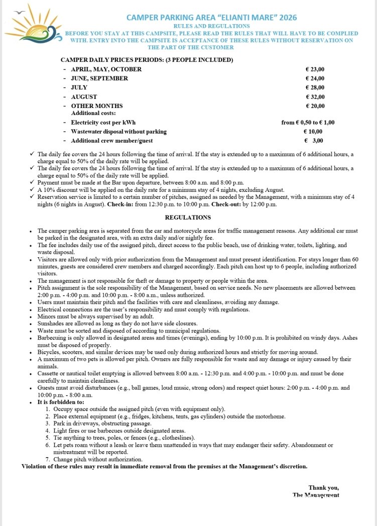 Open from April, price increases as it nears summer (reaching €22 in August) we paid €15 for 24 hours plus €3 for electric in May. Absolutely beautiful spot parked up in an olive grove with the gate at the front leading directly onto the beach. Owner super friendly. The place is called Elianti Mare & was easy to get to in our 7.5 metre motorhome. Highly recommend!