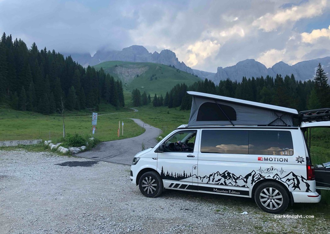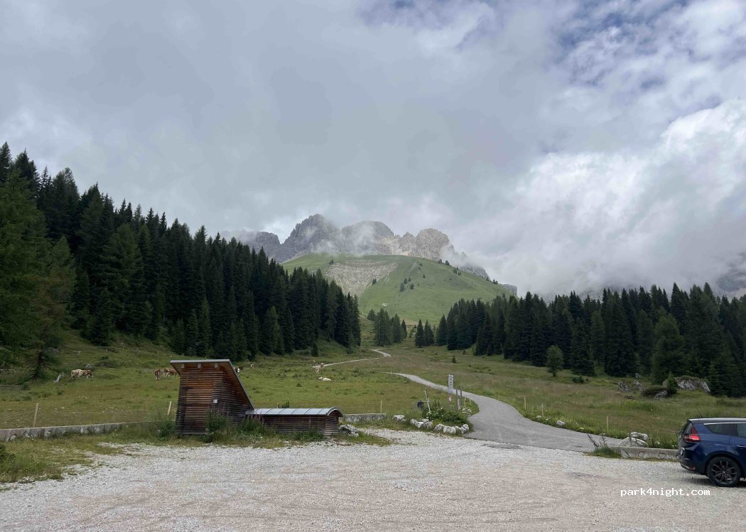 Non ci sono segni e puoi dormire qui perfettamente. Abbastanza piatto con una buona vista sulle montagne (la vista in questo parcheggio è molto migliore di quella a destra guardando da una mappa). Inoltre quasi vuoto il venerdì e la sera di agosto, quindi non è sempre pieno :) .