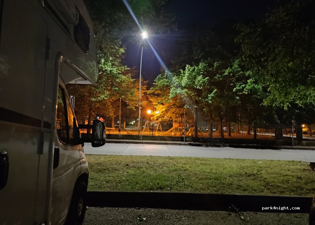 Ampio parcheggio vicino impianto sportivo. Zona tranquilla per dormire e visita centro città (15 min. a piedi). Colonnina acqua potabile a 100 mt. Nessun altro servizio.