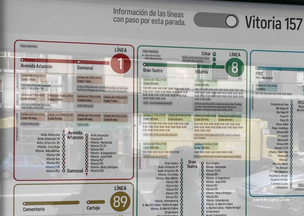 Aparcamiento municipal gratuito. Terreno llano asfaltado con ligera pendiente en algunos tramos. Tranquilo por la noche. Posibilidad de descarga de aguas negras y grises. Fuente de llenado de agua potable y grifo de llenado de agua limpia en el tanque de boca ancha. La columna de servicio no está lejos del aparcamiento, más allá del área de juegos en la parte destinada a los coches. Terreno en excelente estado. Gratuito Desafortunadamente lejos del centro, unos 3,5 km pero con bus (1) muy cerca al centro cada 5 minutos. Se coge en calle Vitoria 157.