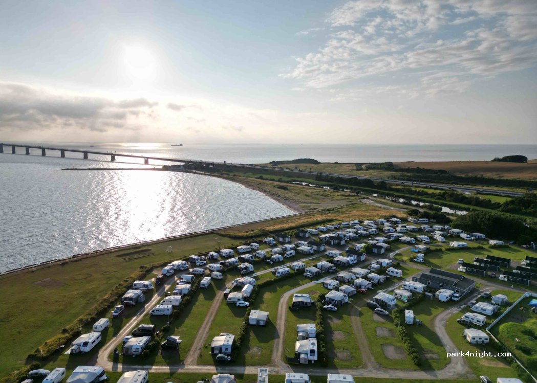 Very nice campsite with beautiful view of the bridge. You can take a nice walk by the beach and go under the bridge. Nice beach for swimming and cozy pool area, miniature golf and playground for kids (and adults) Great facilities with plenty of toilets and showers (5 Kr for 4 minutes paid en departure) electricity for a fee of 15 kr + what you use. Less than 400 DkK for a camper, 3 adults, a dog and electricity. Would definitely visit again.