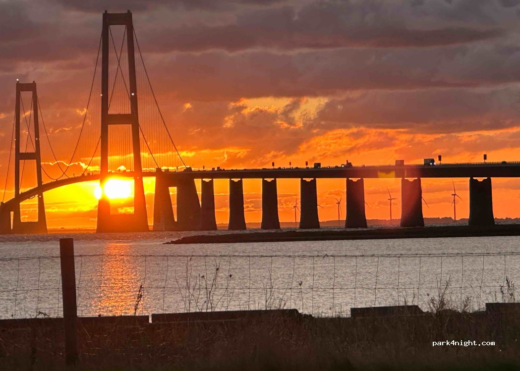 Camping au pied du pont. Idéal pour admirer le coucher de soleil. Nous n'avons pas été dérangé la nuit par le bruit de la circulation. 175 DKK la nuit pour deux tarif sénior.