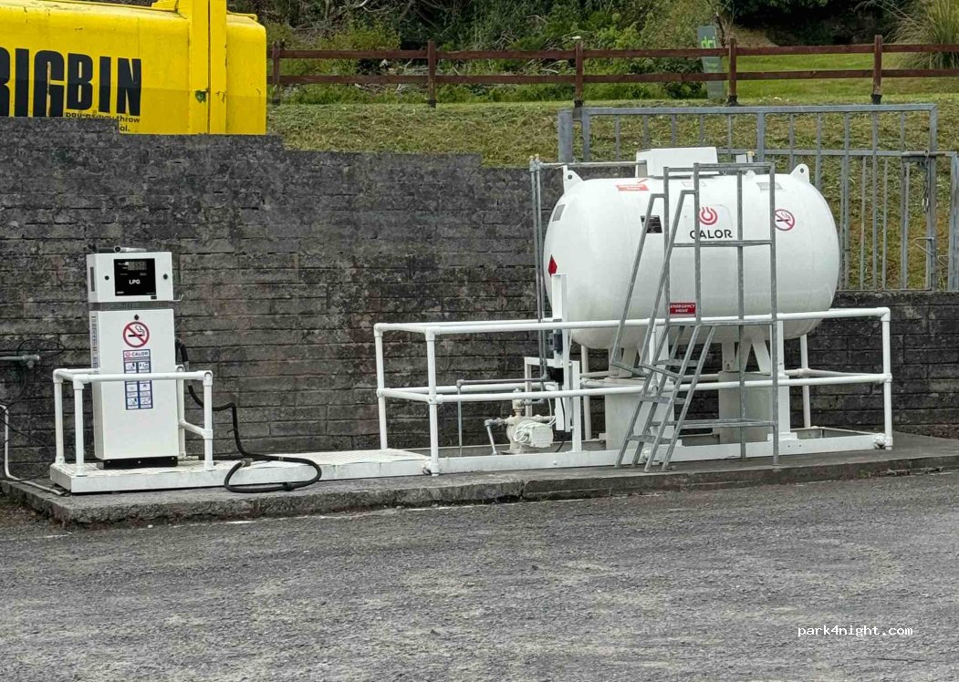 LPG available here (down the slope, below the main garage near the tyre garage) - pay in the garage. Very friendly staff. Happy to let you refill your water tank, empty grey waste & toilet (all down by LPG). There are also large rubbish bins here & the garage has a small shop for essentials.