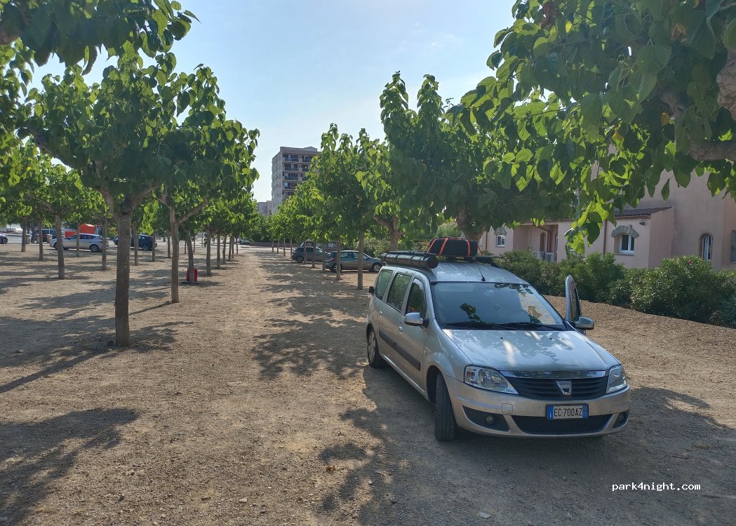 Parcheggio abbastanza ampio vicino alla spiaggia senza servizio. Un po' d'ombra con gli alberi lungo i sentieri. Quartiere tranquillo. Non so però se c'è la possibilità di pernottare lì.