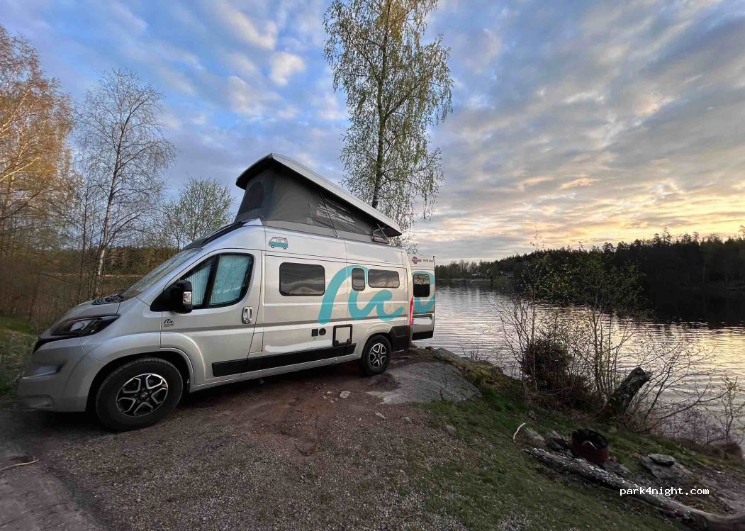 Toller Platz, mit einem umgebauten Van etc. kein Problem, mit einem Wohnmobil wird es sicherlich etwas eng da man recht dicht an der Straße steht, ist aber machbar. Schöner Ausblick auf den See, guter Zugang auch zum Baden oder Kajak fahren. Angel Karte für die Region lässt sich bequem im Web kaufen. Recht abgelegen und wenig Verkehr