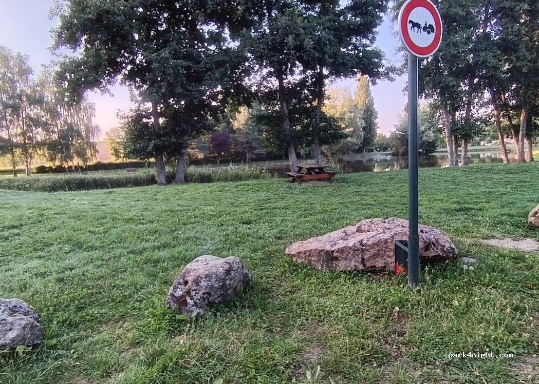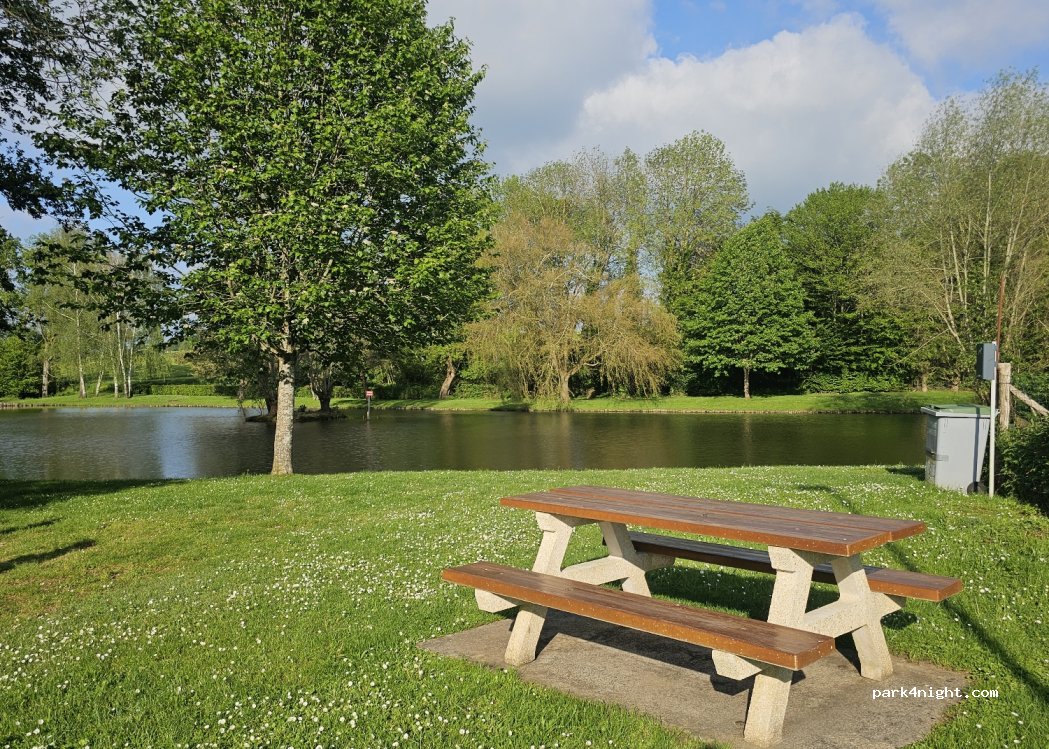 Endroit calme pour une petite halte prêt d'un étang pour la pêche. Aucun service, juste une poubelle. balade possible autour de l'étang avec les chiens en laisse