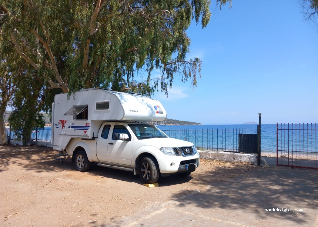 Very warm welcome on arrival. Beach front pitch with EHU 23 Euro, 2 adults. 30 min walk to town. Powerful, hot showers. Everything clean but worn. We had campsite to ourselves. Taxis available in town. Pleasant sea breeze. Basic, peaceful, Greek.