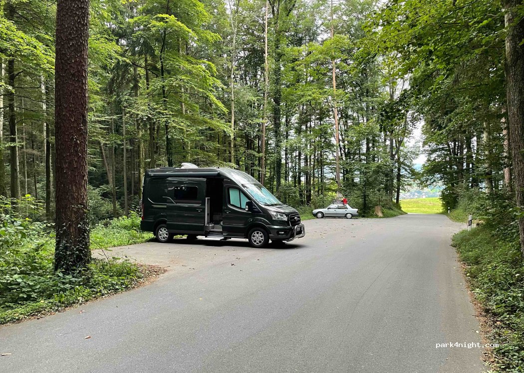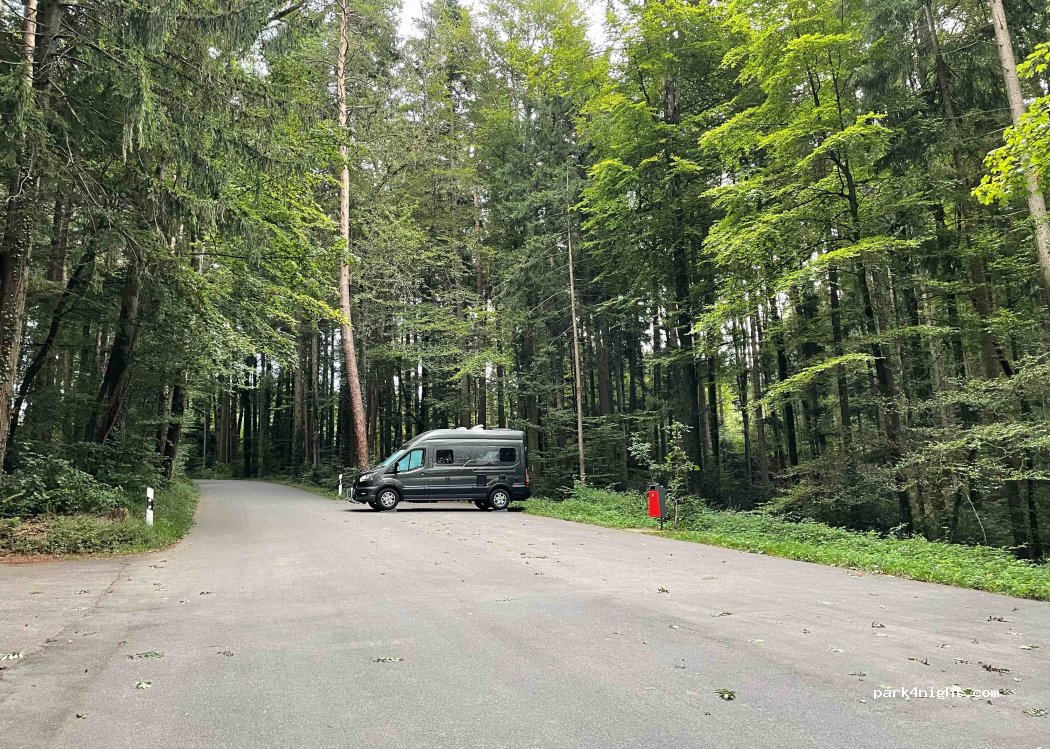 Parking at the edge of a road. Very quiet, surrounded by large trees, we stayed here for one night. Maxi 6 meters.