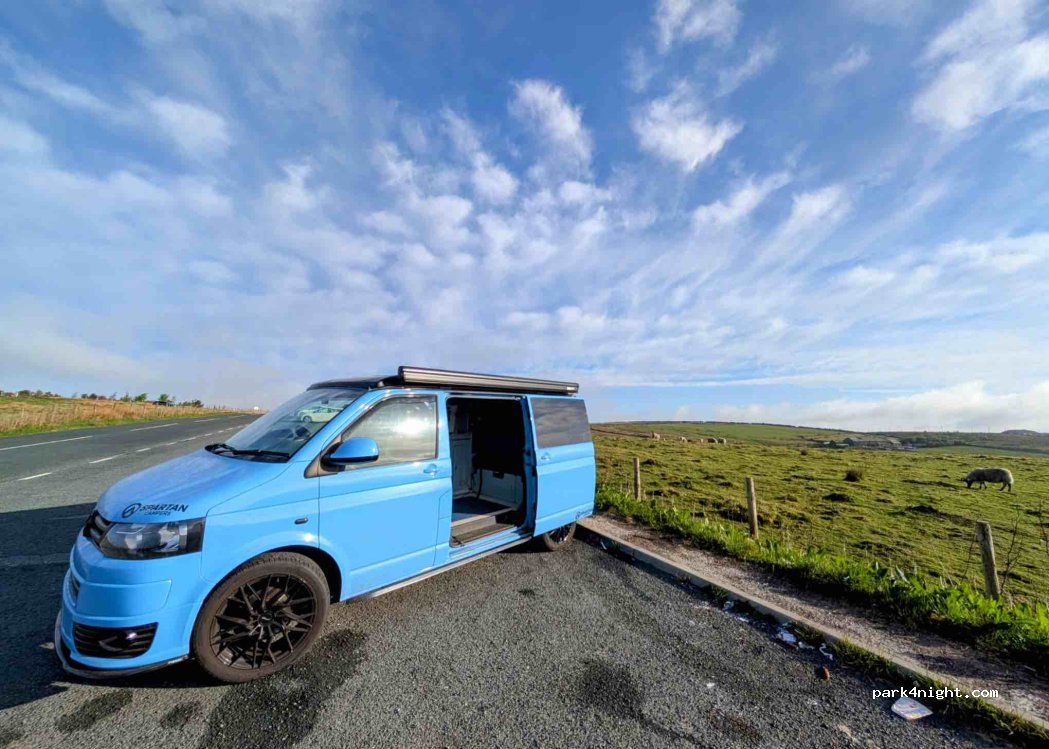 A large sloping lay-by with great views. We were the only van there on a Friday to Saturday overnight in May. The road was moderately busy morning and evening. The lay-by slopes along its length but it’s not too much of a gradient if parked 90 deg to the road. No issues with any anti-social behaviour. Gets busy with people walking their dogs from about 7am onwards.