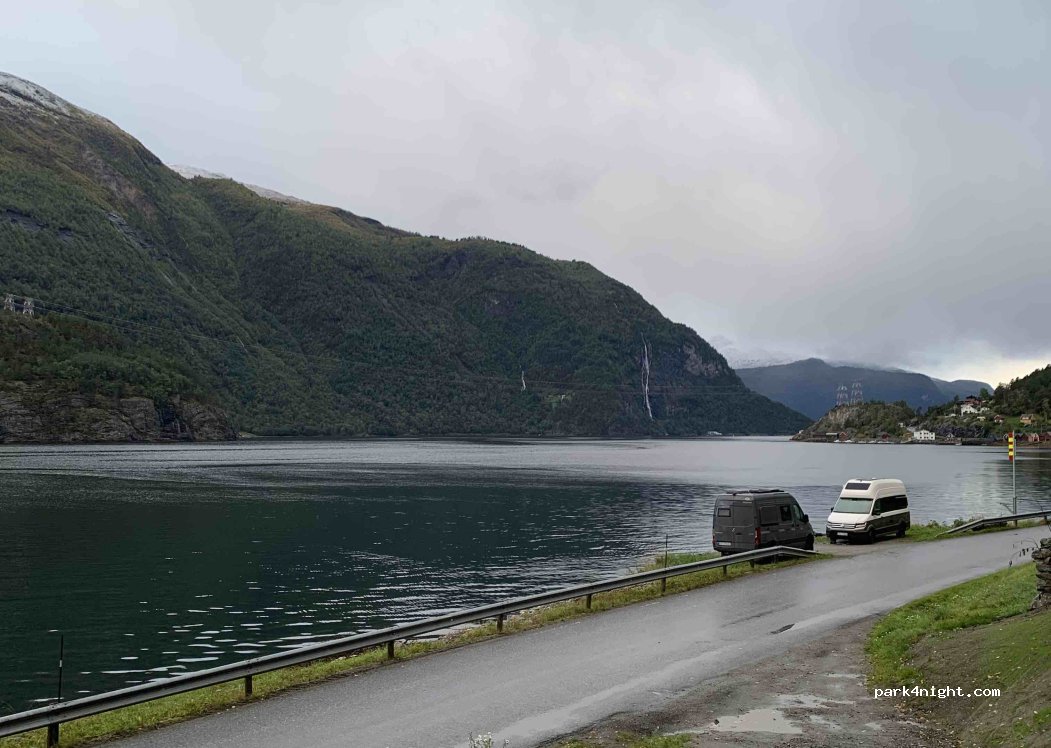 Wunderschöne Aussicht auf den Fjord. Leider direkt an der Straße, die aber wenig befahren ist. Bietet Platz für maximal 2-3 Camper. Der Wasserfall kann sehr laut sein, was uns aber nicht gestört hat.