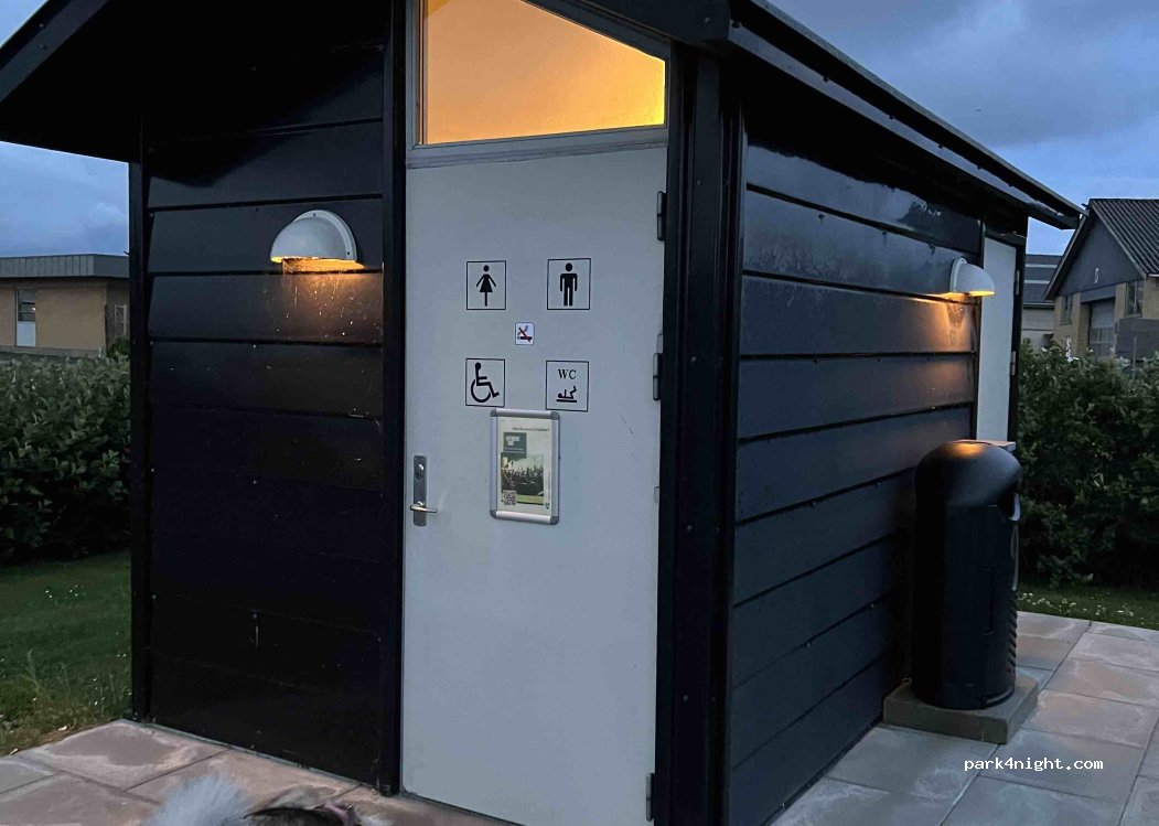 le parking pour voitures est de l'autre côté, rue sondervigveg. toilettes nickel, côté camions, je ne peux pas ajouter de photo, mais pas de panneau d'interdiction pour la nuit