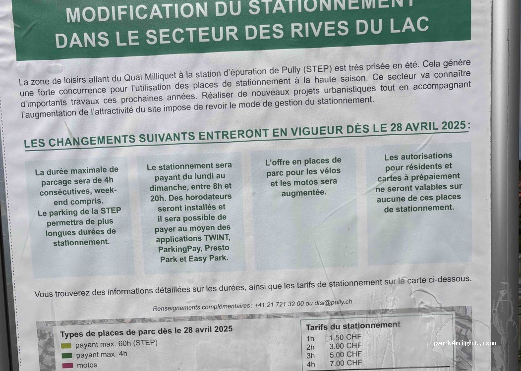 Lugar precioso y tranquilo. Al lado del lago. Ideal para dormir e ir a Laussanne a un párking de pago para verlo. Lejos del centro de Laussanne para ir andando. Del 1 de Octubre al 30 de abril sin limitación horaria. Desde el 30 de abril máximo 15 horas. Estuvimos dos noches.