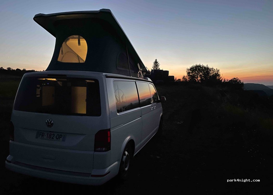 Small dirt road entering a "field" that does not seem to belong to a farmer, ask him. Well go to the end of the dirt road to get away from the road to face the view. Absolute calm. Place for a Van (road a little difficult to access for a CC).