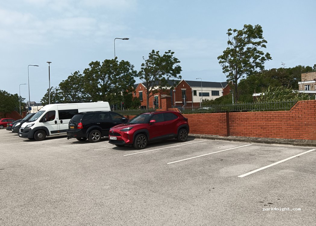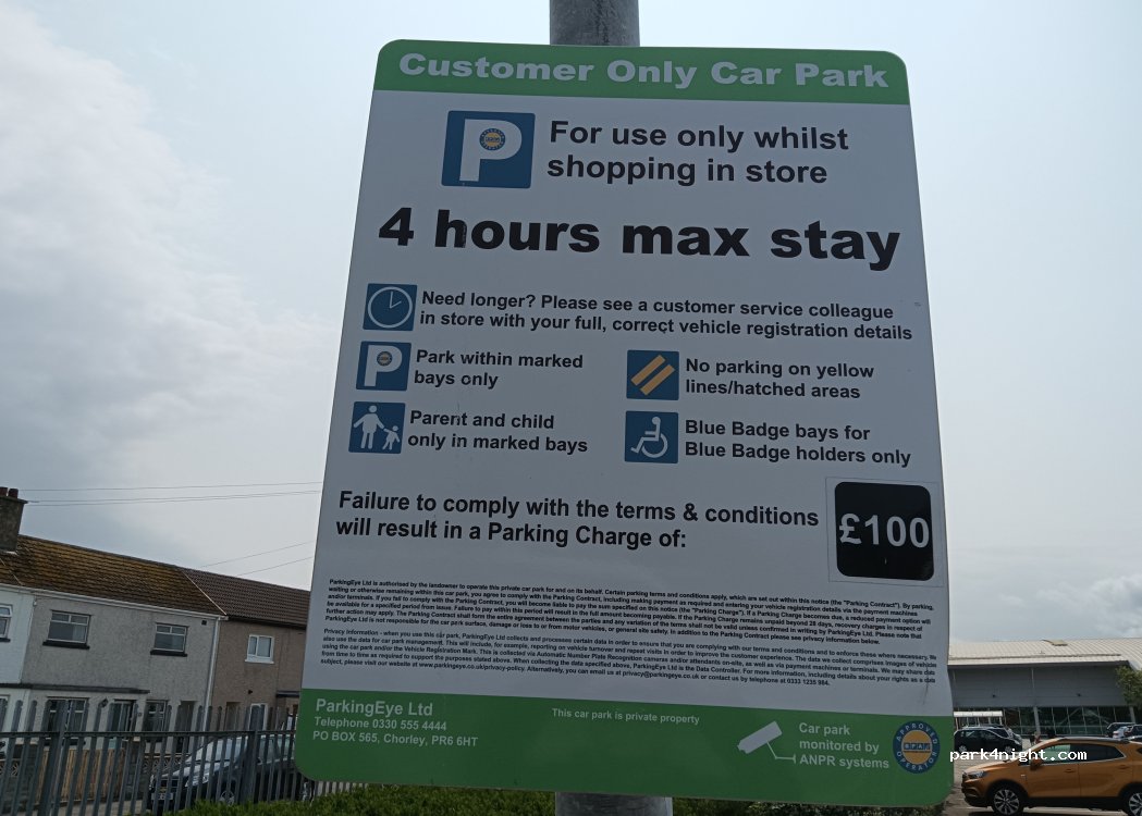 4 hours max stay parking at Asda. Plenty of spaces, especially in the top corner. Opposite the shopping centre with new look, primark, TK Maxx etc. Also a short walk into the town centre and sea front. Plenty of time to explore area. Toilets in Asda.