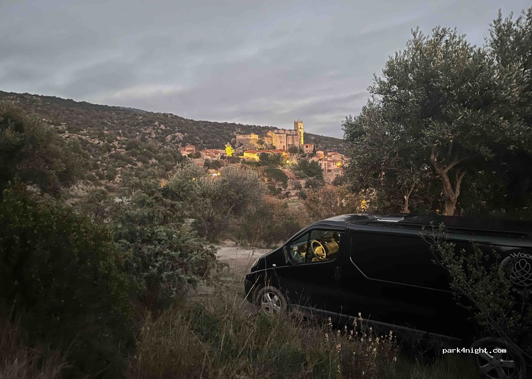 Amazing place to stop overnight. Very quiet, with beautiful view overlooking Eus and its surroundings. Also nice shade in the morning. Acces only to vehicles under 2,2m wide and spot for vehicles under 2m high. In the morning, some walkers and locals passing by.
