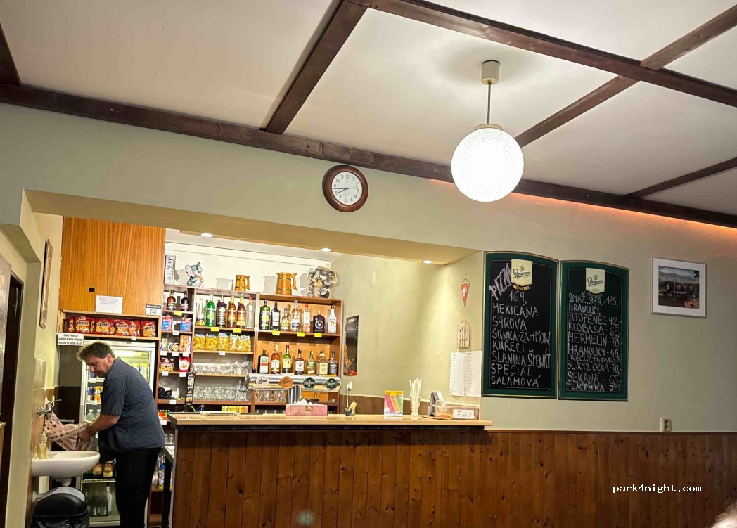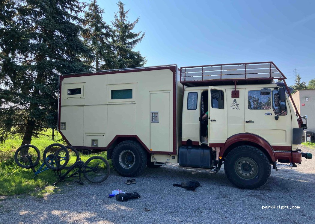 Kleine parkeerplaats tegenover voetbalveld. We parkeerden naast de ingang maar toen kwam de (vriendelijke) dorpsoudste ons vertellen dat we aan de overkant moesten staan en dat dat helemaal prima was. Niks bijzonders aan deze plek maar voor ons een mooie plaats voor fietstocht naar Praag (ca. 20km).