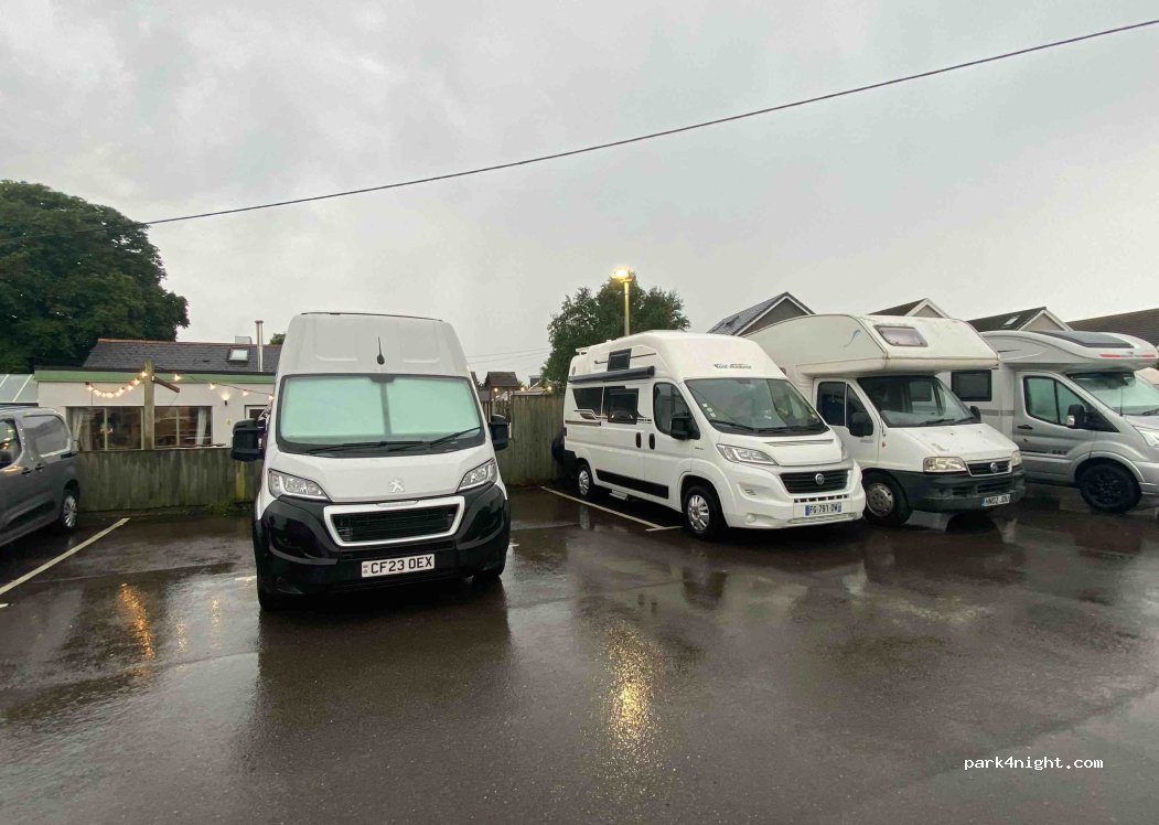 Allowed us to stay overnight even though they were closing early & the kitchen was closed. Ordered pizza from little place in Southgate which was amazing! A bit noisy with cars coming & going in the car park, but stopped eventually. No views. Great coastal walks nearby, 5 minute drive away.