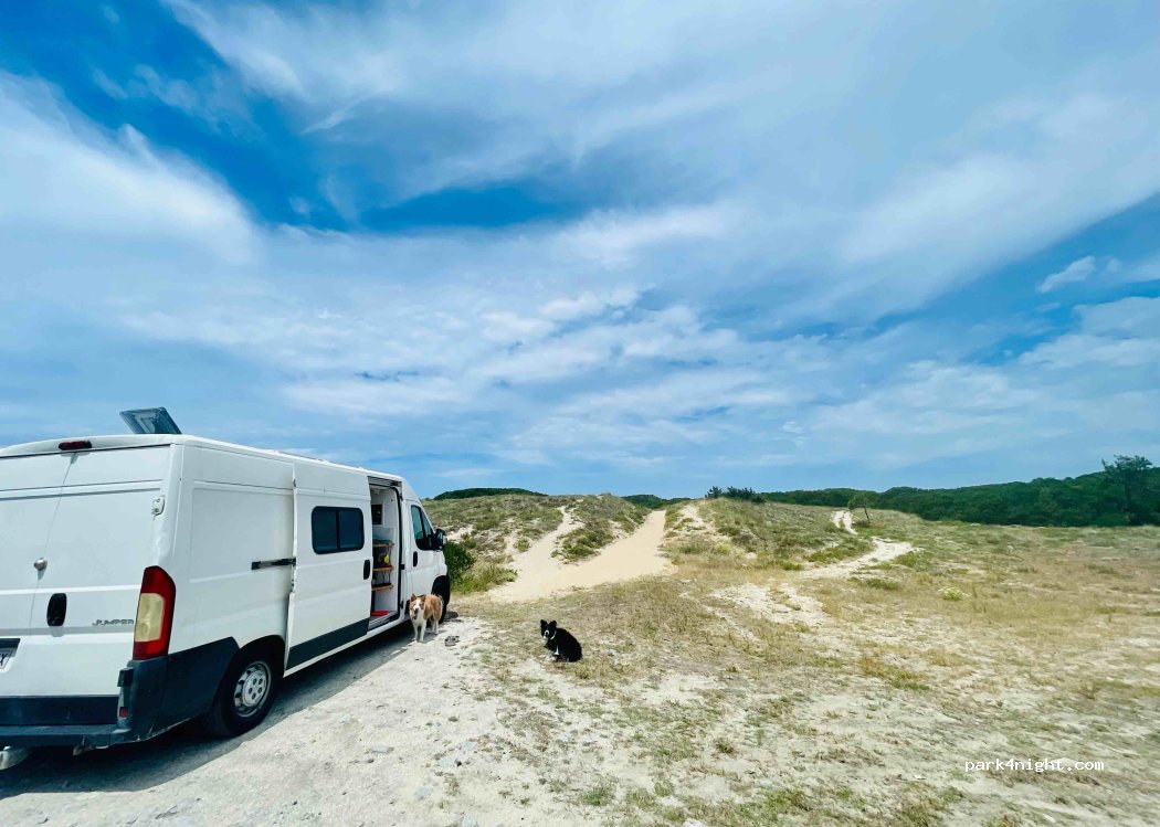 Pas besoin d’un 4x4 pour arriver au début de parking. Lieu à l’abri du vent dans les dunes très agréable. Seul en pleine nature. Aucun service. Merci de garder le lieu propre !
