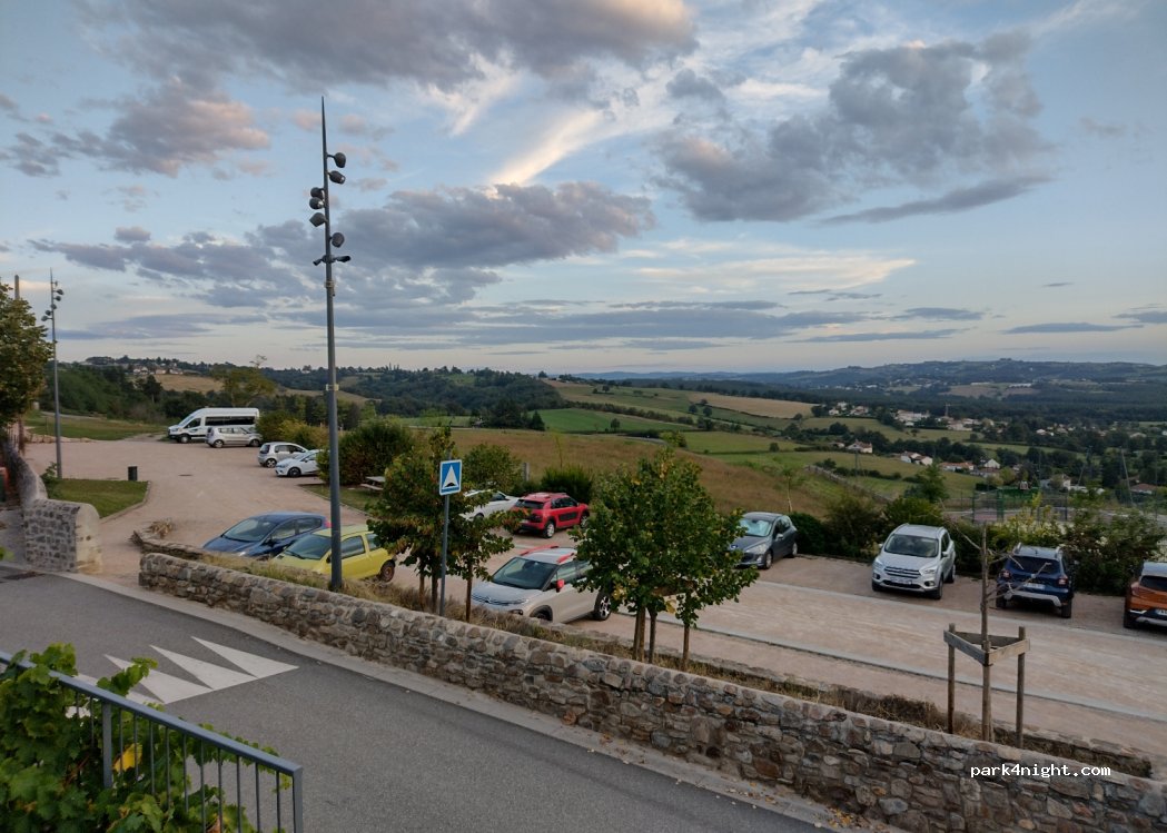grand parking refait avec sanitaires publics gratuits. pas de hauteur pas de barrière avec une vue sur la plaine du Forez plein ouest à côté du château et de la boulangerie et d'une très bonne auberge avec cuisses de grenouilles ...burger forezien... notamment. très calme.