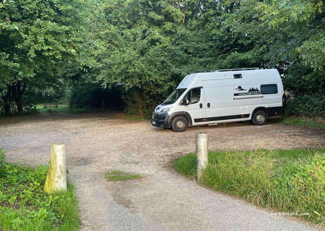 Lovely little car park, quite rural. Can get a Vivaro / transit through the bollards. Quiet through the night ( except wildlife). Light local Traffic from 7am and lots of dog walkers once it got light (8:30).Area busy with horse riders, cyclist and runners. Beautiful walks all around. Picnic table.