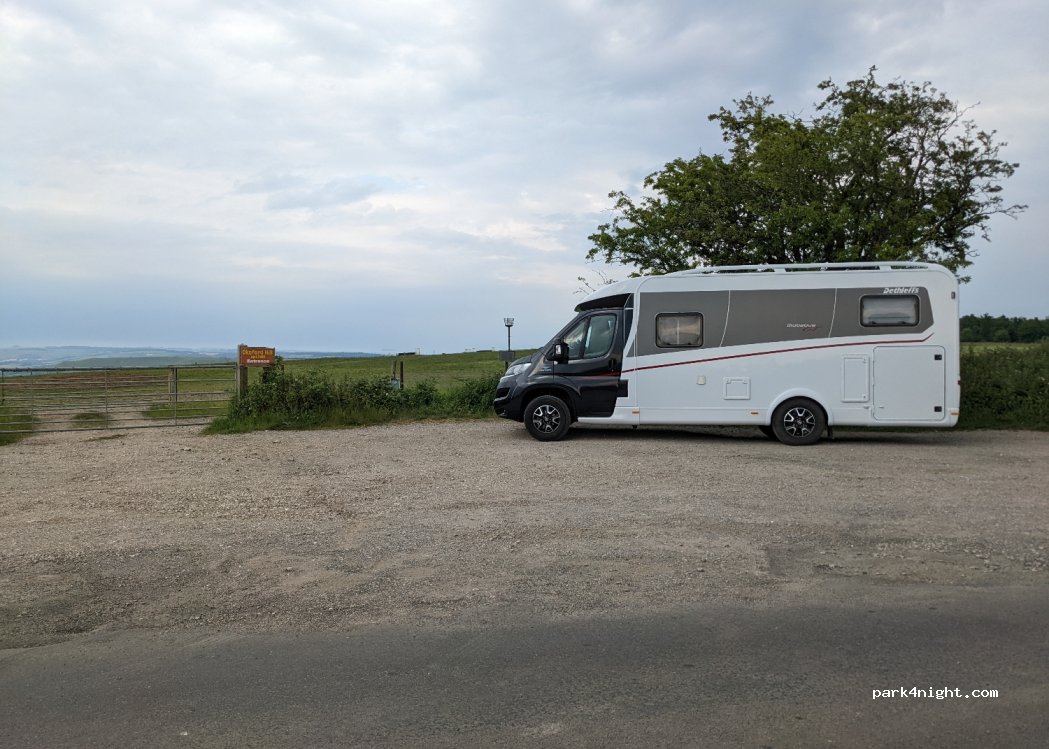 I found the enterence bollards too narrow for a Citroen Relay van so, 50m up the road is a layby/wide field entrance (wide enough for a few cars and vans together. Good views there and reasonably quite road. Watch out for cycle club patrons in early morning. They come thick and fast.
