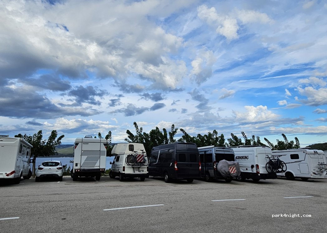 superbe vue. nous avons même passé la nuit avec 4 autres camping car (après avoir posé la question à la vendeuse du kiosque) sans aucun problème. route un peu bruyante