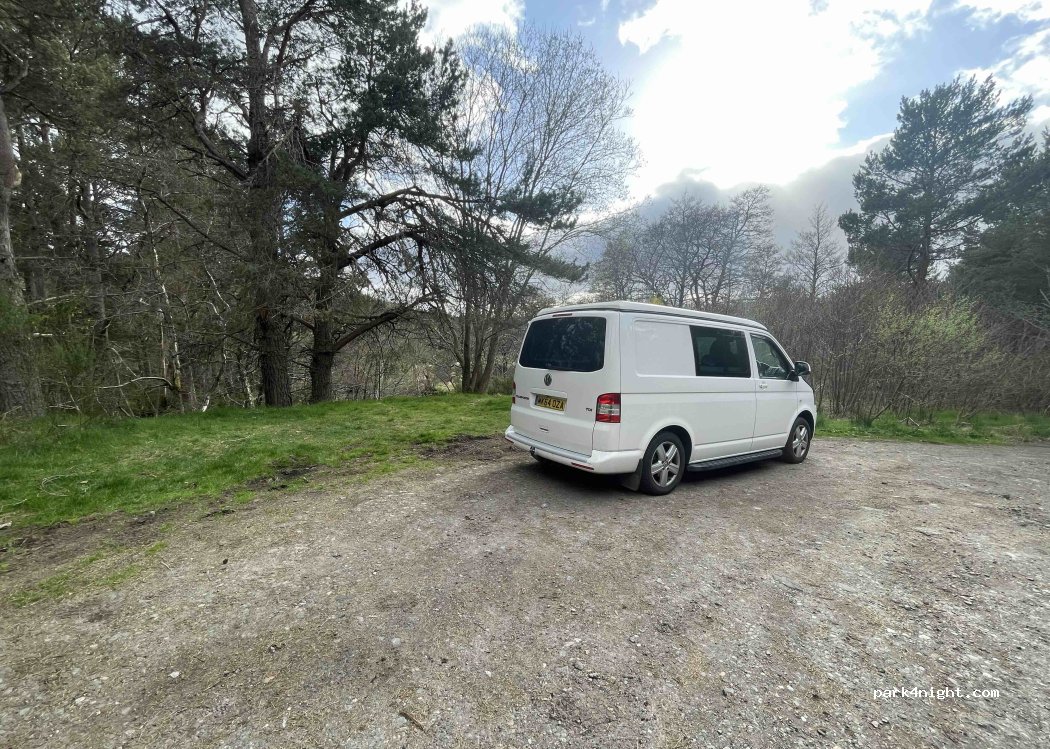 Lay bye’s on side of road, no signs preventing overnight - multiple locations, some obstructed by low hanging trees (watch your height). Great place to stop as local car parks at Loch Morlich are no overnight (when we were here this was being ignored by many people). Just move into the car park in the morning when you get up.