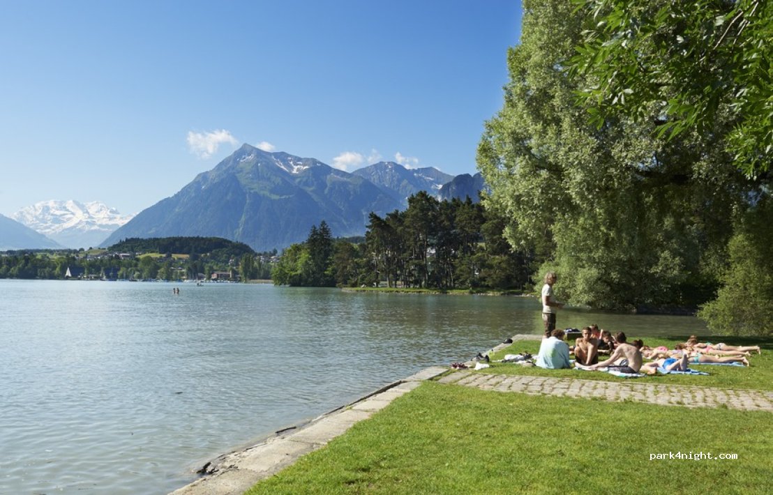 Toller Platz direkt am See, wenn auch sehr teuer. Zum Glück waren wir in der Nachsaison, trotzdem für eine Übernachtung mit Womo und 2 Kindern 84 € bezahlt. Bei längerem Aufenthalt kann man scheinbar Vergünstigungen bekommen wie z. B. kostenlos den Bus nach Thun nutzen. Die Stadt ist sehenswert.