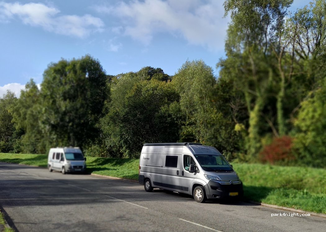 Parking on side of road in an industrial estate We parked off the main road so it was quite apart from security guard changing staff in evening and early morning. There appears to be alot of people park to walk along the river and some young people to race there cars, but again none of these disturbed us s away from the main road. Good for a one night stop over.
