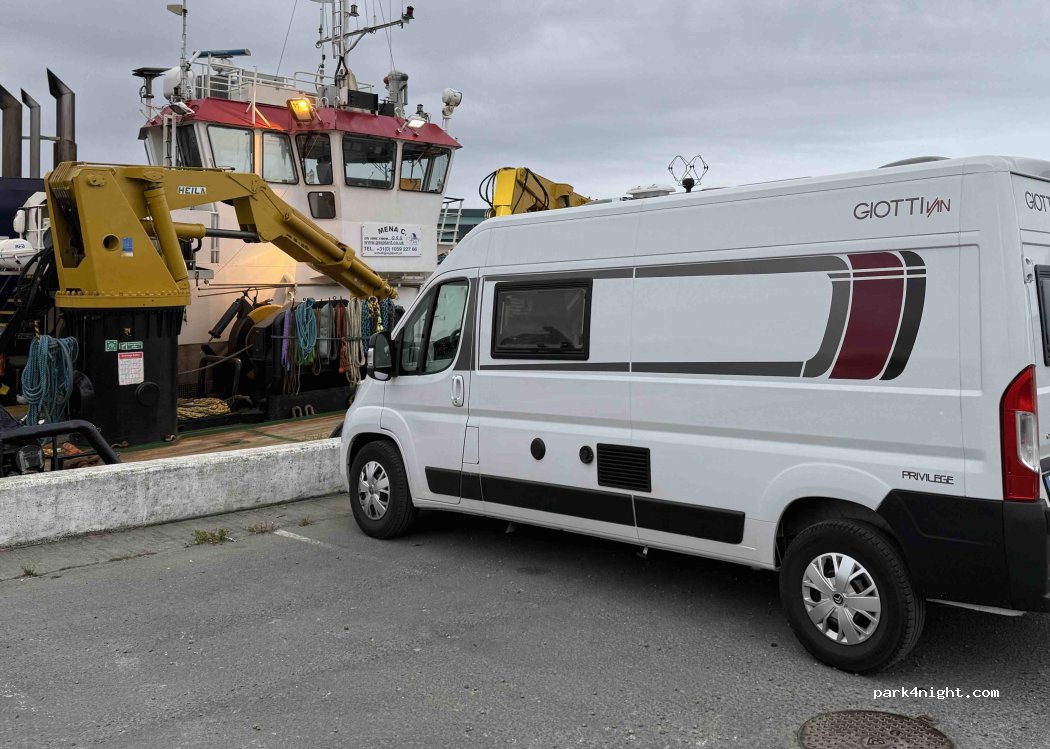 Places de stationnement gratuites contre le mur de la marina. bien éclairé, à 15 minutes à pied du magasin et d'Aldi. Vues pittoresques d'un côté, port animé de l'autre. Bruit constant à faible niveau des bateaux et des camions, etc. mais pas trop mal. Eau douce gratuite.
