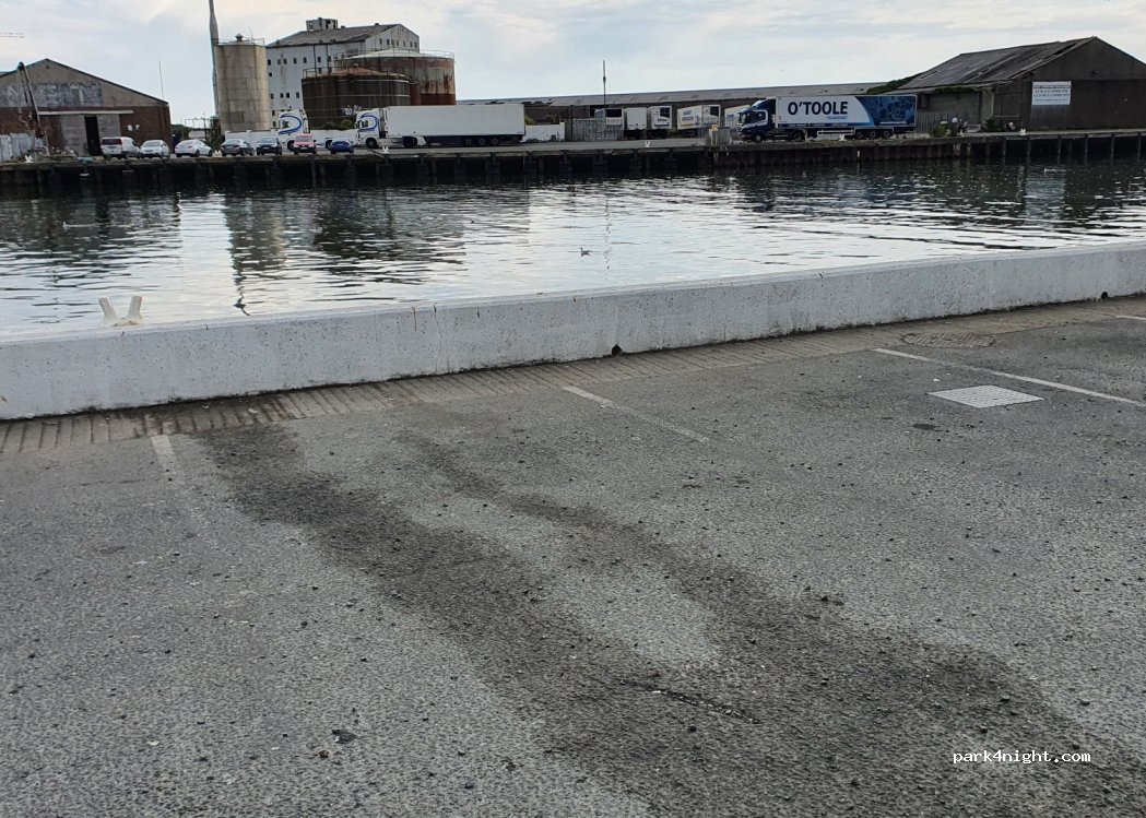 Free parking bays against the marina wall. well lit, 15mins walk from the shop & Aldi. Picturesque views one direction, busy harbour the other. Constant low level noise from the boats and lorries etc but not too bad. Free fresh water.