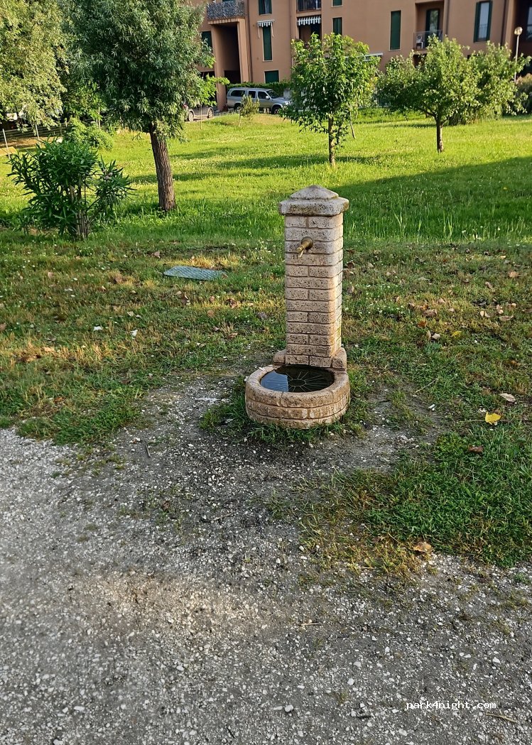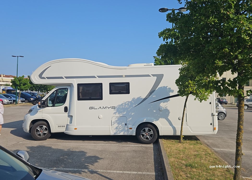 Parcheggio pubblico con piazzole a dimensione d’auto ma sborsando con il retro nelle aiuole ci si sta perfettamente , nessun cartello divietò per i camper o di pernottamento notturno , supermercati vicini , vicini alla strada un po’ rumoroso ma siamo stati bene , chiaramente ideale solo per un passaggio e una notte