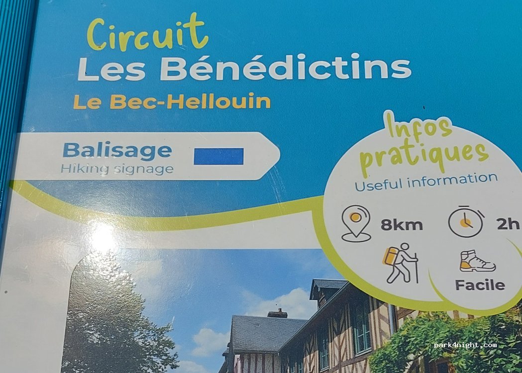 Parking at the exit of the very pretty little village of Bec-Hellouin, after the Abbey and the small washhouse. Go a little further towards the old station, parking for camper vans. Picnic tables 100 m away.