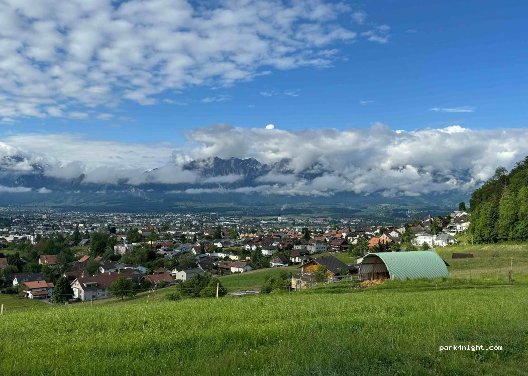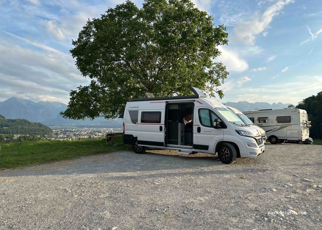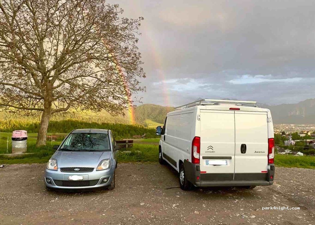 Parkgebühr 5 CHF für 12 Stunden. Parkplatz ist direkt an einer Strasse. Es gibt nur zwei ebene Standplätze. Die restliche Parkfläche ist schräg