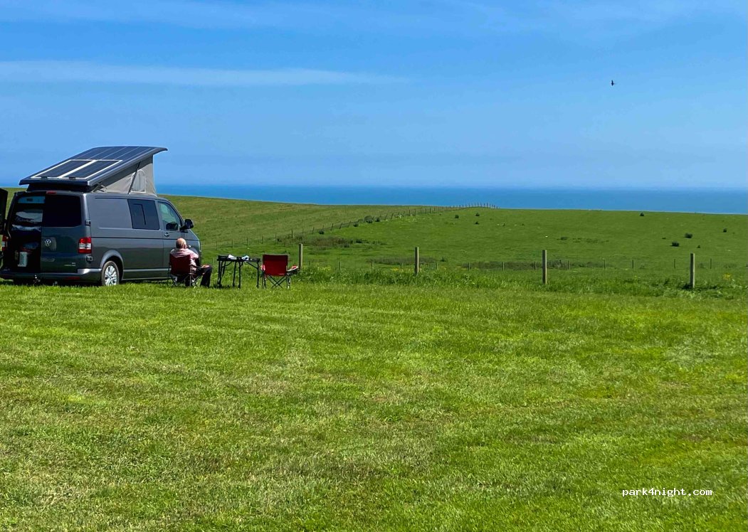 Stunning location with sea views. There is a private path to the white chalk cliffs with puffins and gannets to see. Very tranquil. Basic facilities. Usually £28. Bank holidays £35. Site is very popular with motorhomes. Good access along the road, just keep to 20-25mph
