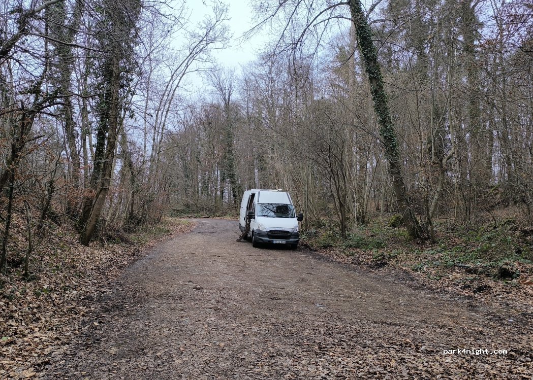 Es un camino entre árboles, paralelo a la carretera, que tiene un espacio que se ensancha ligeramente donde poder aparcar. Un poco forzado, pero funciona para una noche. El problema es que no está totalmente plano. Pasaron varios caminantes y nadie nos llamó la atención, que ya es un logro. Muy tranquilo y silencioso. Aparcar lo más arrimado posible para no molestar el paso de los coches.