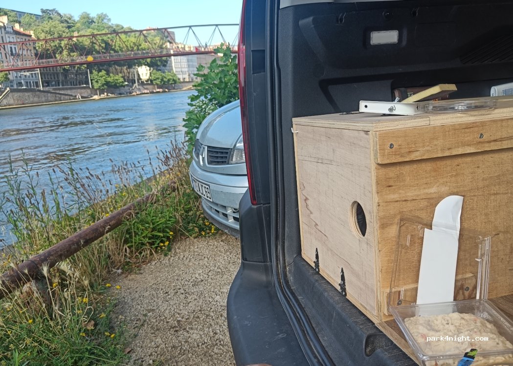 Nuit passée avec toit ouvert en t5. ATTENTION. Le spot est cool mais ce dimanche au réveil nous avons la magnifique surprise de voir les coureurs d'un Run sur la berge d'en face, et du coup les barrières fermés ici, nous sommes donc enfermés techniquement jusqu'à 16h. L'information se trouve sur internet mais aucune signalisation sur le lieu... la ville de Lyon est vraiment à la ramasse.