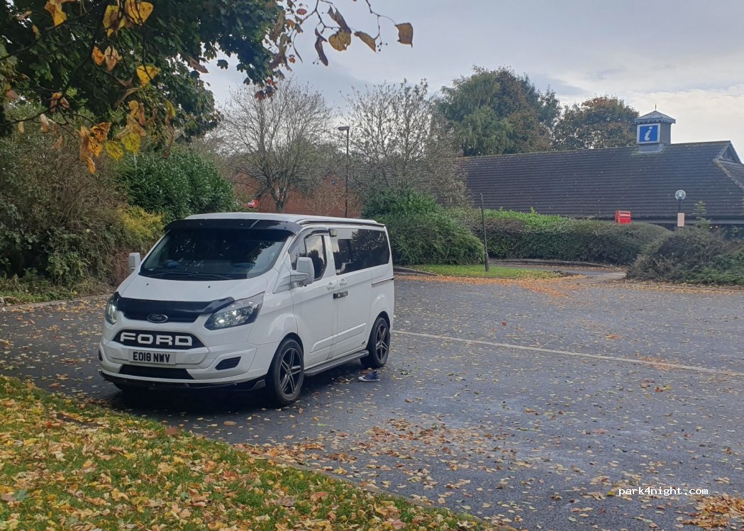 The car park is labelled as 'caravan and coach parking' on Google maps to help you find it. Big space enough for several vans. We stopped for one night and used the very nice toilets in esso petrol station. We also did some litter picking to help keep it nice and get some good will! I was thanked by the Burger King staff for it.