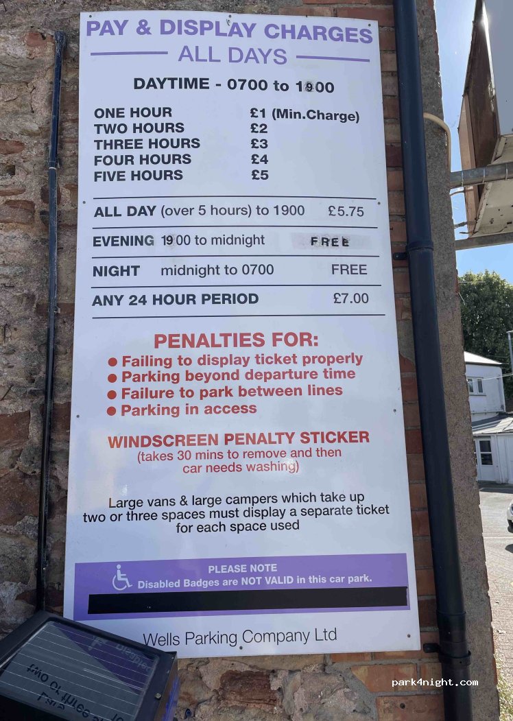 Private car park behind council car park some spaces big enough for motorhomes. £5.75 all day. 7 pm to midnight 25p/ hour. Free midnight to 7am. 24 hour ticket £7.00. Make sure to get ticket from correct machine and park between markers.