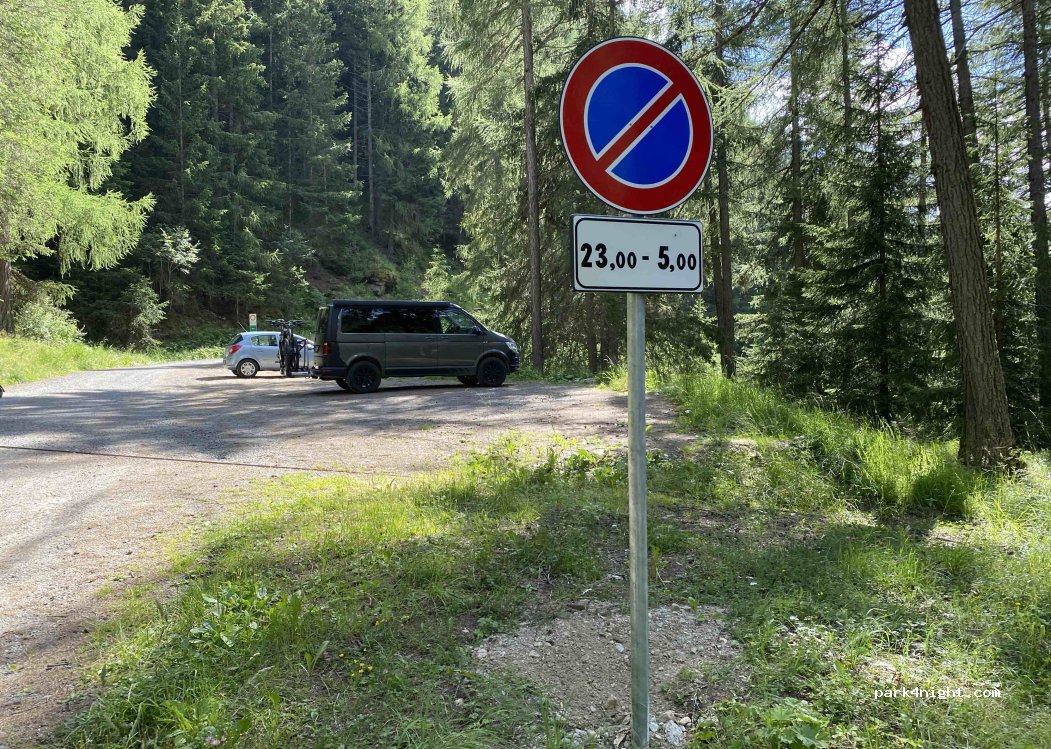 Eigentlich ein schöner abgelegener und ruhiger Platz im Wald, aber leider gilt über Nacht ein Parkverbot. (s. Foto)