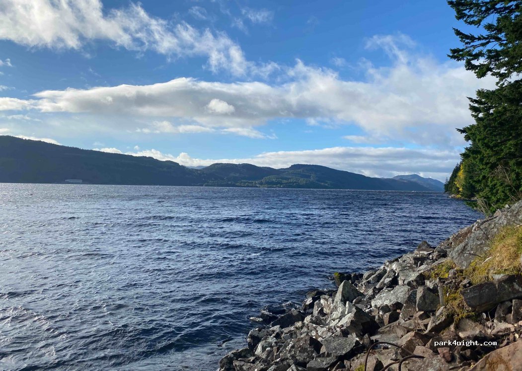 Stayed here for one night. You can't move over far enough to stop the rocking from fast vehicles, but very quiet after 22.00. A couple of steps down to Loch Ness and you are on a nice little beach.