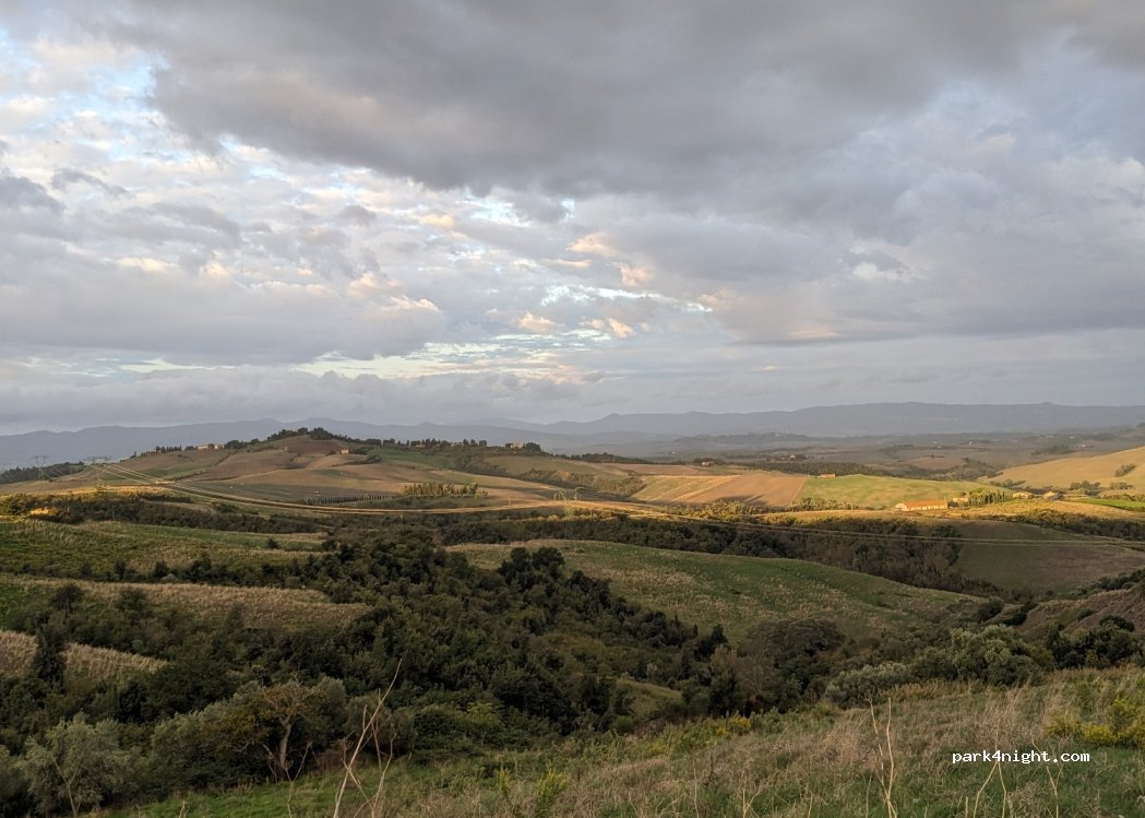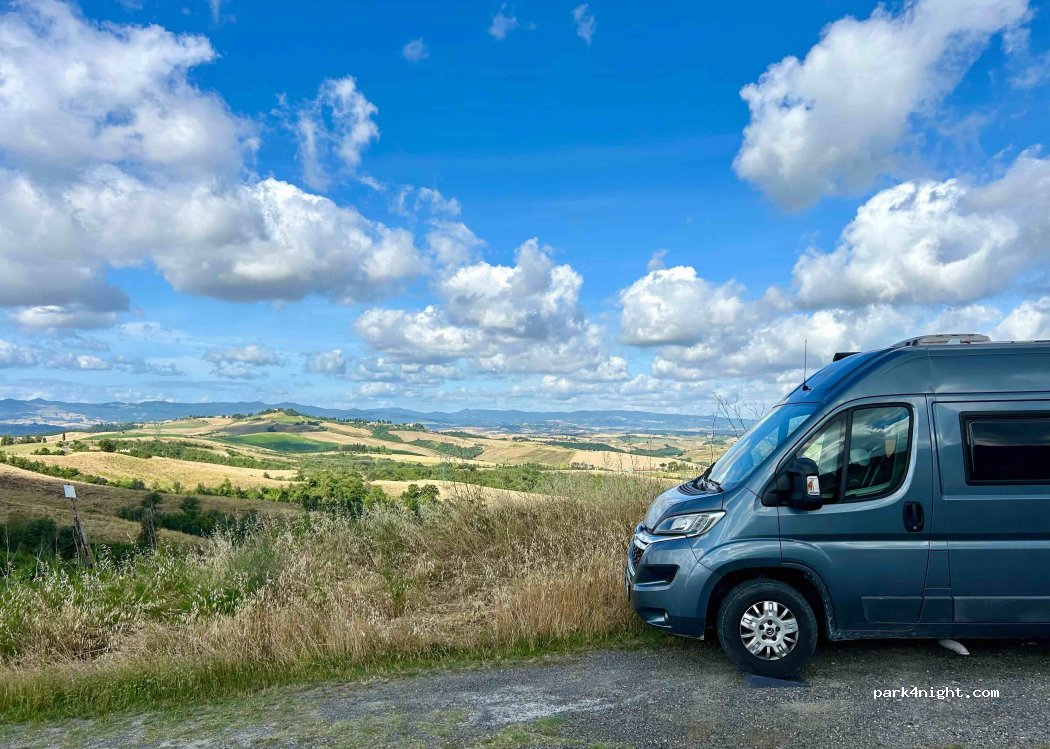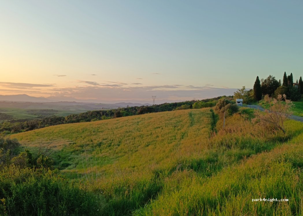 Traumhafter Hügel - Stellplatz an einer sehr wenig befahrenen Straße. Mit einer wunderschönen Aussicht auf die Hügellandschaft der Toskana. Malerischer Sonnenuntergang garantiert!