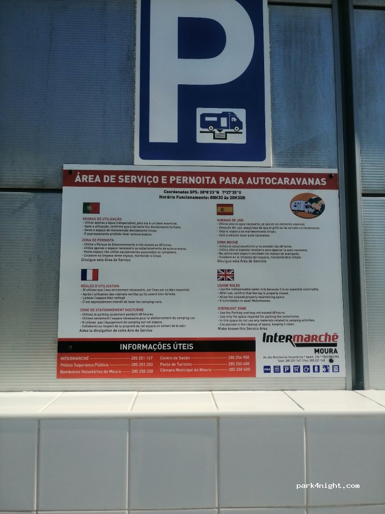 Open space in the INTERMARCHÉ supermarket car park, W side of MOURA city. Ask for the keys in the store. Free Services. Shop from 08:30 to 20:30 but overnight is authorized.