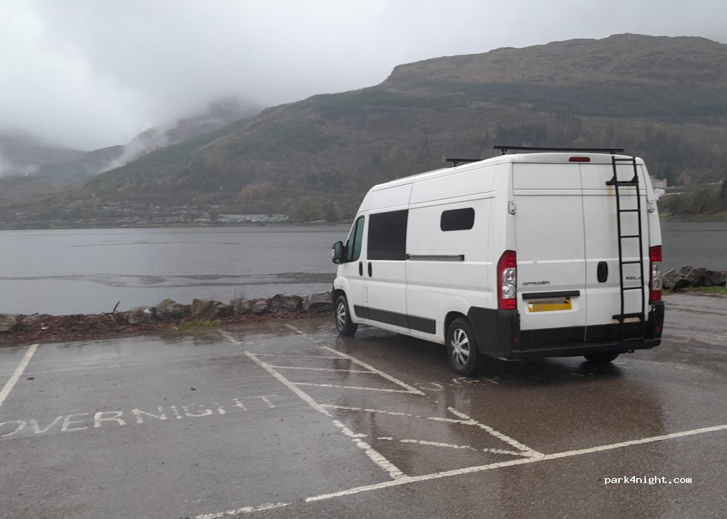 Two large slots on a car park facing the Loch in a beautiful village. The slots are marked overnight parking but there is a sign up saying about no over night parking, we went to the Post office and made a donation to the Mountain Rescue to stay overnight. Lovely spot but don't abuse it as we were told that people have in the past and things may well change.