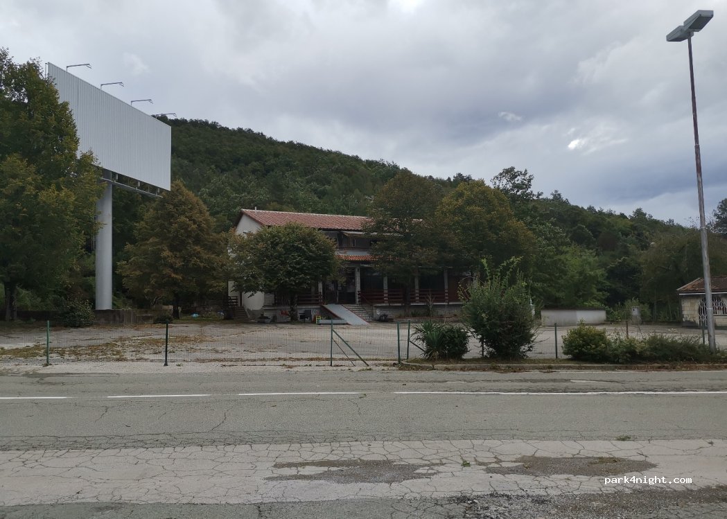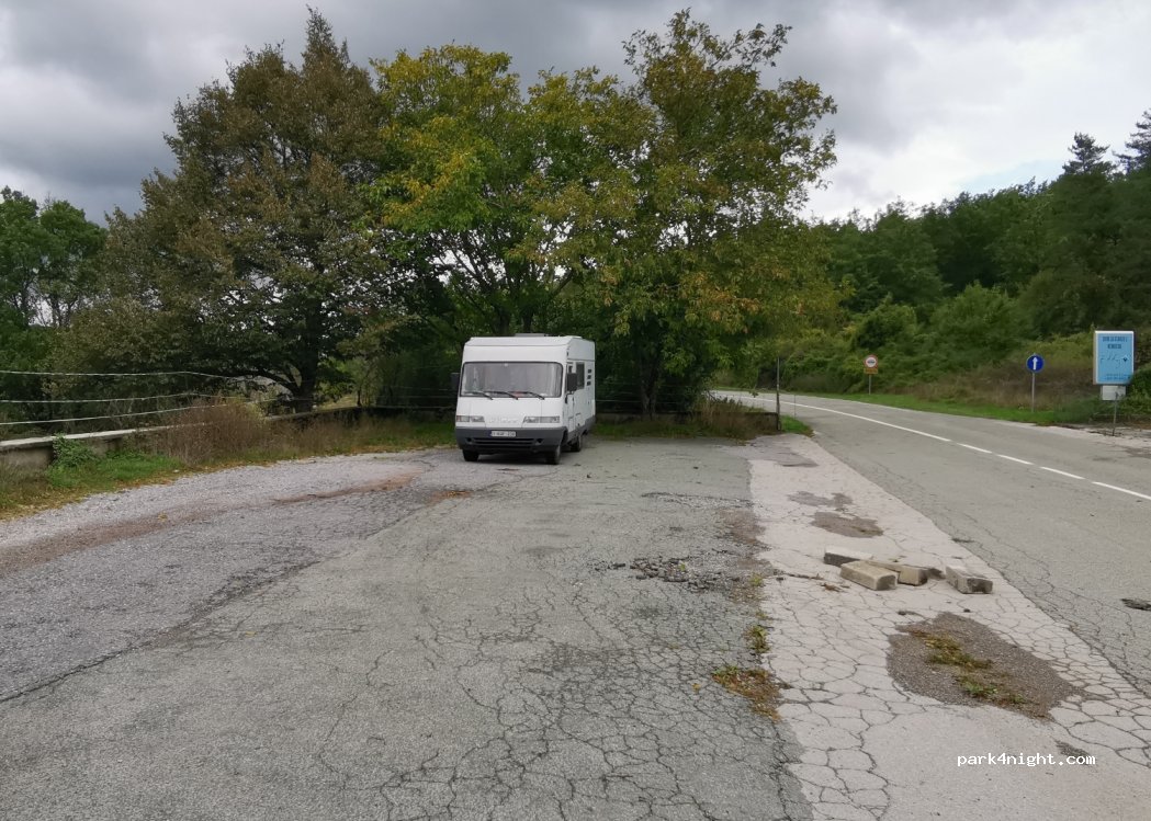 Grand parking le long de la route, près de la frontière avec la Slovénie. Juste en face d'un restaurant. Nous y étions 1 nuit, début octobre (hors saison) Pratiquement pas de circulation nocturne. On ne sait pas si le parking appartient au restaurant en haute saison, il n'y a rien de balisé...