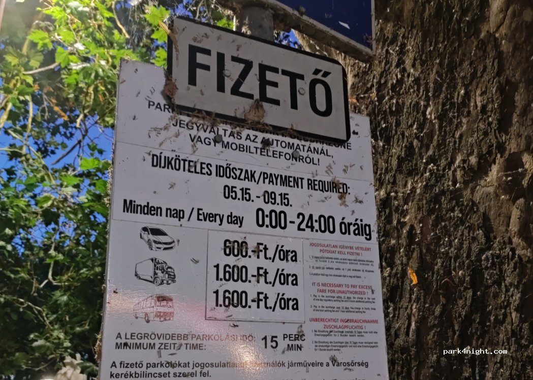 Der Parkplatz kostet inzwischen von 7-24 Uhr und zwar 480 Ft/h (Pw) und 1200 Ft/h (Lastwagen und Bus)