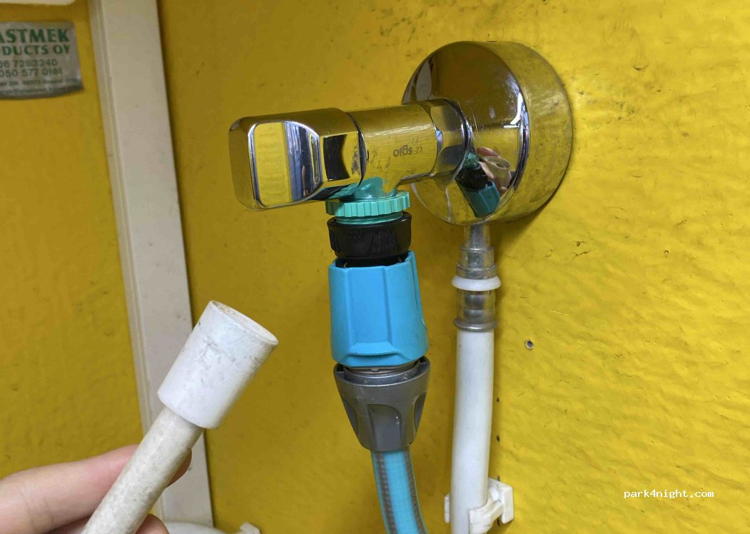 Wir konnten problemlos Wasser nachfüllen. Der Schrank ist beheizt, so hat das auch bei Schnee und Eis funktioniert. Wir haben den weißen Schlauch einfach vom Hahn abgedreht und unseren Schlauch daran befestigt.