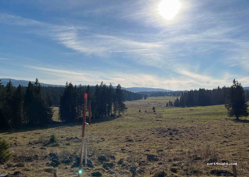 Small parking lot on the side of the road with little traffic. A pretty traditional Swiss landscape with its chalet and the mountains in the distance