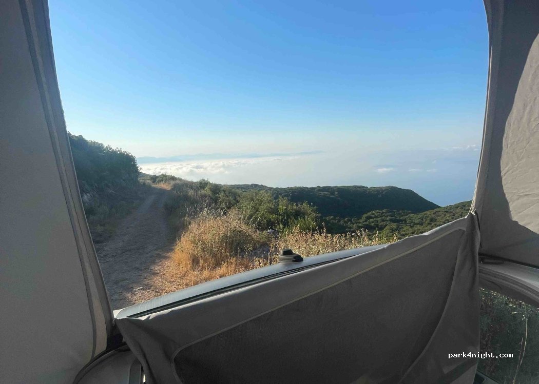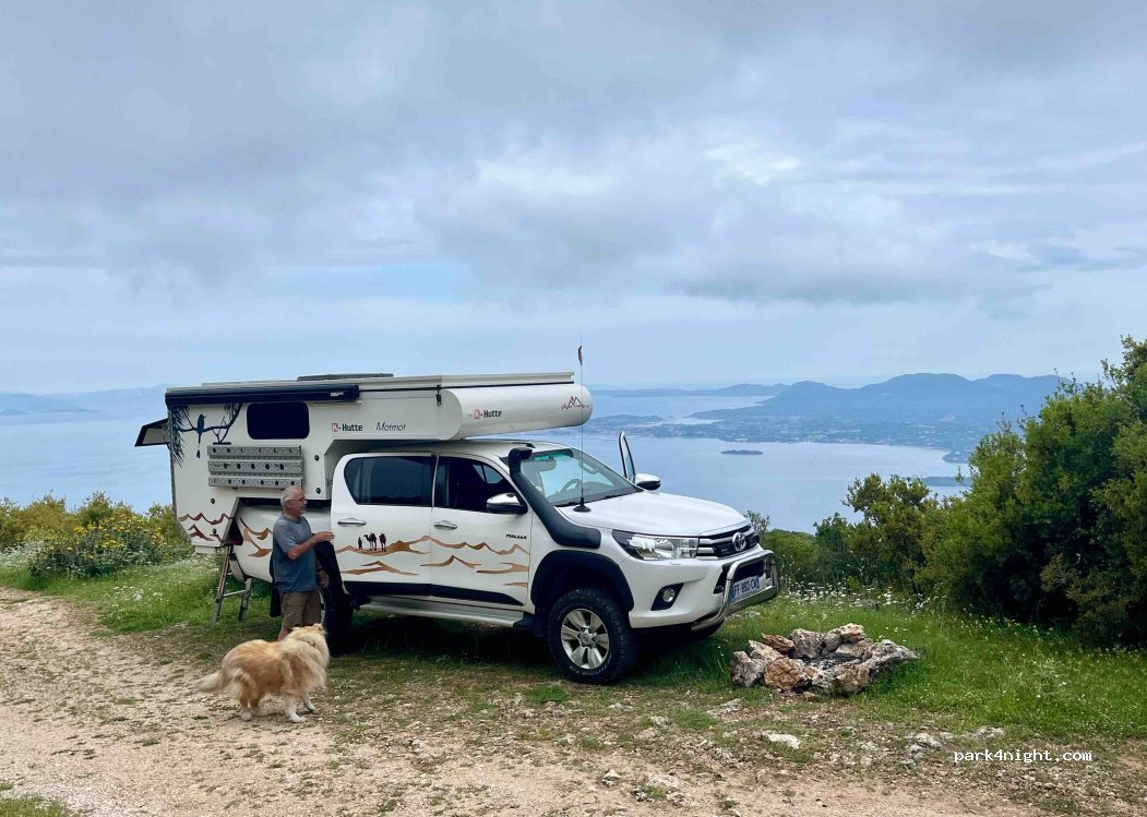 Die Aussicht ist wirklich atemberaubend. Ein toller Ort, um dem Trubel in Korfu zu entfliehen. Die letzten 2.7km sind steinig aber auch mit einem T3 ohne synchro gut machbar! Auf der Strasse hoch zum Sendemasten gibt es eine Wiese mit ein wenig mehr Schatten. Ich habe hier 2 Nächte verbracht.